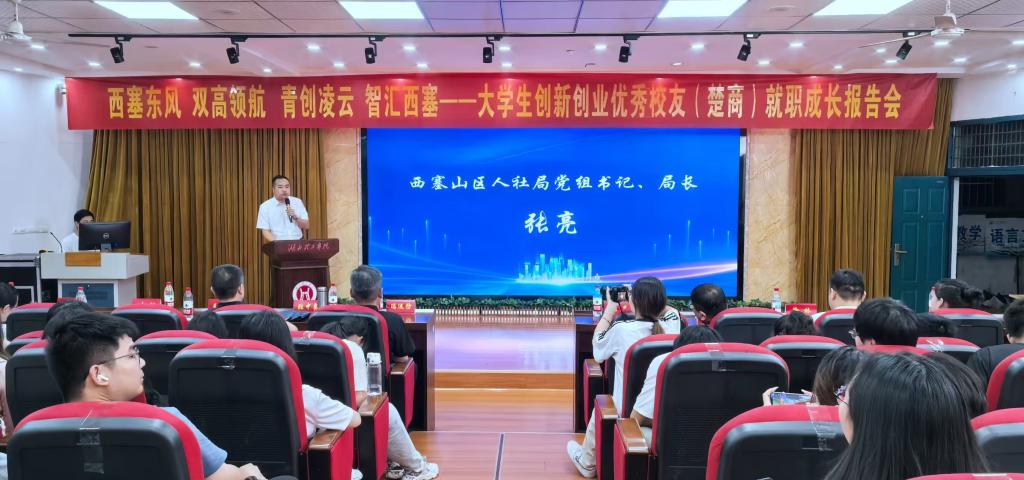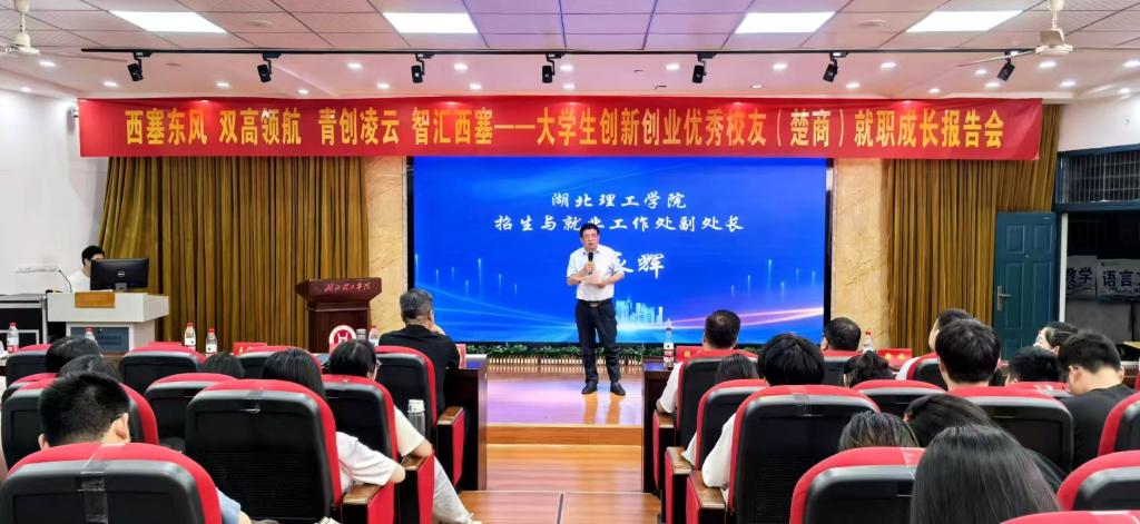 本网消息 5月15日晚,76net必赢官网招就处、学工部、师范学院联合西塞山区人社局,在外国语学院113报告厅举办“西塞东风·双高领航 青创凌云·智汇西塞”——大学生创新创业优秀校友就职成长报告会。活动承载着政府、高校和企业对青年学子就业创业的深切关怀与殷切期望。学校党委常委、副校长冯运仿出席报告会。出席报告会的还有黄石市人事考试院副院长张中良,西塞山区人社局党组书记、局长张亮,西塞山区人社局党组成员、公共就业和社会保险服务中心主任綦慧敏,76net必赢官网党委宣传部常务副部长王定兴、招生和就业处处长罗建军、外国语学院党总支书记占赢、师范学院党总支书记郭栋、招生和就业处副处长董永辉、师范学院方红教授等西塞山区和学校相关部门领导和嘉宾。