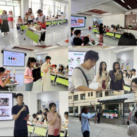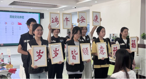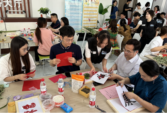 在“趣体验·民俗文化跨界之旅”环节,各学院带来了丰富多样的体验活动。医学院李缘章科普中草药知识,展现传统中草药的智慧;化工学院董卿解说香囊制作,让大家感受传统手工艺的精巧;数理学院贾诗晨讲解五彩绳编制技巧,师生亲自动手编织平安祝福;师范学院周冰雨同学现场展示剪纸技艺,全体师生还共同完成了剪纸作品《端午安康岁岁皆顺意》;外国语学院谢启月、范道羿同学带来双语解读《探寻端午文化底蕴,领略中西节庆风采》;国际学院留学生王晶莲、雨希同学用中文教大家包粽子。此外,室外的射五毒、编织五彩绳和室内的制作绿豆糕等互动体验也吸引了众多师生参与。