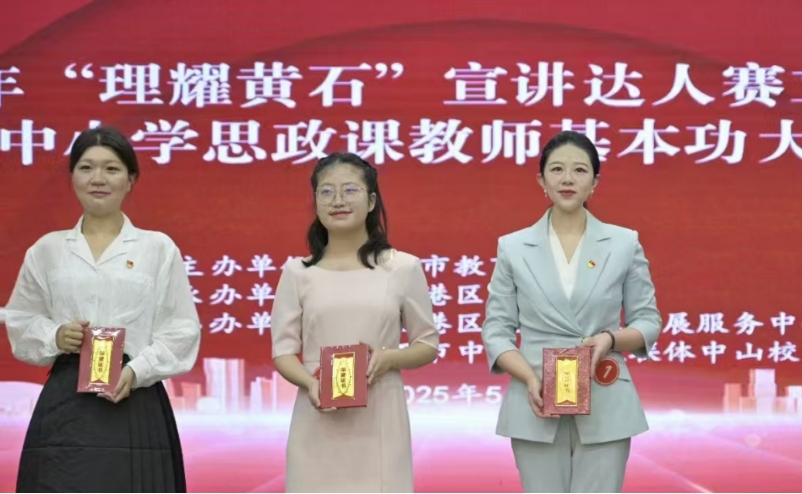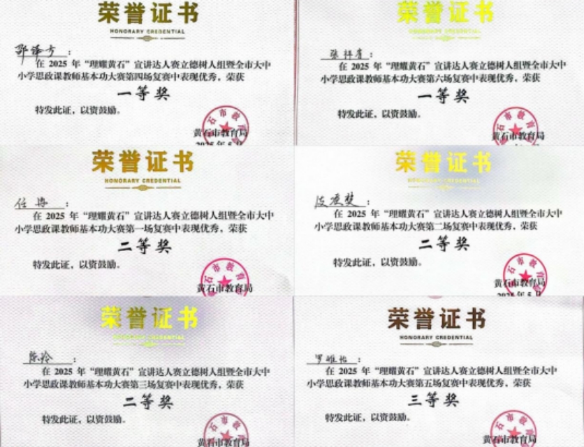本网消息 近日,“理耀黄石”宣讲达人赛立德树人组暨黄石市大中小学思政课教师基本功大赛复赛结果揭晓。76net必赢官网选派的6名思政课教师凭借扎实的理论功底、出色的表达能力和精彩的宣讲内容,在6个县市区众多参赛选手中脱颖而出。其中邵泽方、张祥省老师获一等奖,皮凌斐、任冉、陈玲老师获二等奖,罗雅怡老师获三等奖。黄石市委宣传部组织多家媒体对六场比赛进行了全方位的宣传报道。