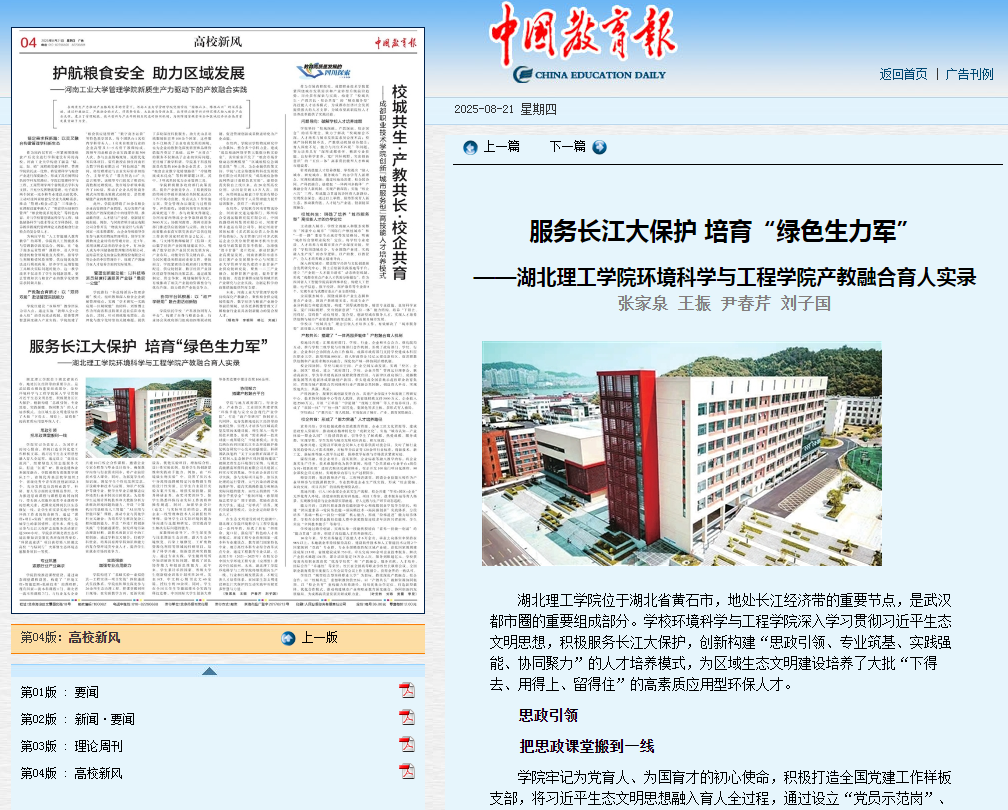 本网消息 8月21日,《中国教育报》在“高校新风”专版,刊发文章《服务长江大保护 培育“绿色生力军”》,展示76net必赢官网环境科学与工程学院产教融合育人新成果。