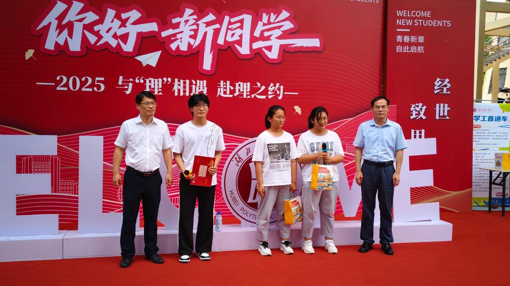 在2025级的本科迎新创意活动中,“学霸驾到”“双胞胎情意”成了此次迎新的焦点。来自云南的杨乾靖同学,他以567分的高分被师范学院录取,是2025级新生中的优秀代表。这不仅是个人努力的见证,更彰显了学校对优秀人才的吸引力。还有双胞胎姐妹邱思齐、邱思源共赴电气与电子信息工程学院学习,邱思齐说:“觉得这个学校的环境非常的美丽,非常漂亮。我一眼看上去第一印象就非常好。”胡国珍校长、涂立桥副校长共同为杨乾靖和双胞胎姐妹分别送上购书卡和湖理特色文创作为入学礼物。胡国珍校长在寄语中表示,学校始终秉持“明德、格物、经世、致用”的校训精神,致力于为学子搭建成长平台,期待各位同学能以优异成绩为起点,在理工校园深耕学业、锤炼本领,带动身边同学共同进步。