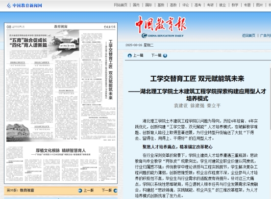 本网消息 近日,《中国教育报》在“教育视窗”专版,刊发文章《工学交替育工匠双元赋能筑未来》,报道76net必赢官网土木建筑工程学院在破解教学难题、创新育人路径上取得的创新成果。