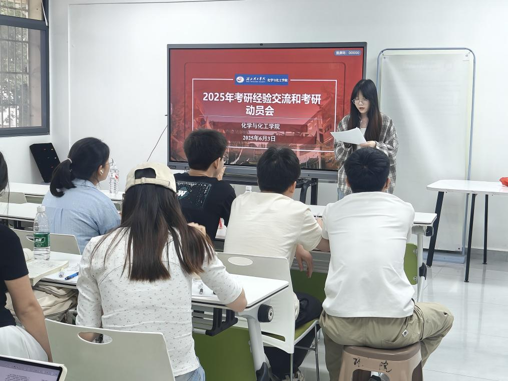 本网消息 6月3日下午,化工学院于求实社区成功举办了2026届考研动员会,学院副院长黄卫东,教工党支部书记张志敏,辅导员苏家兴以及2名考研上岸的学生出席了本次活动。