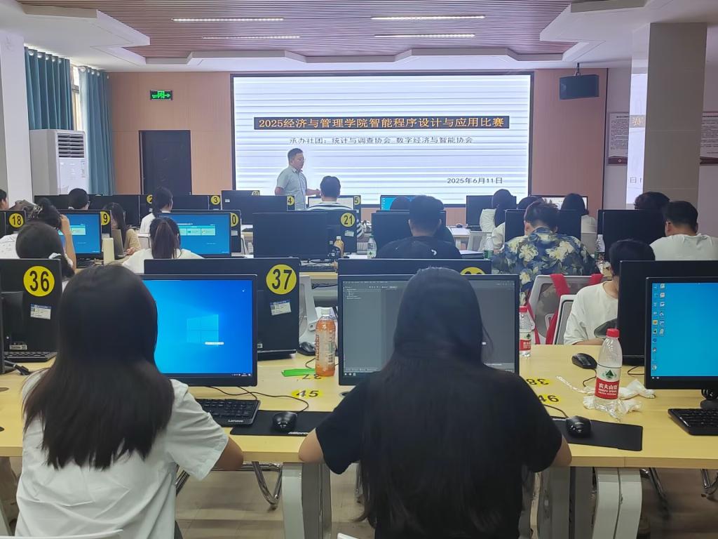 本网消息 6月11日下午,经济与管理学院首届智能程序设计与应用比赛在X3-102实验室顺利进行。这是近年来经管学院首次举办以程序设计和应用为主题的比赛。本届比赛由统计与调查协会和数字经济与智能协会承办,吸引了以工商管理专业学生为主的10组团队共计30余人参加。