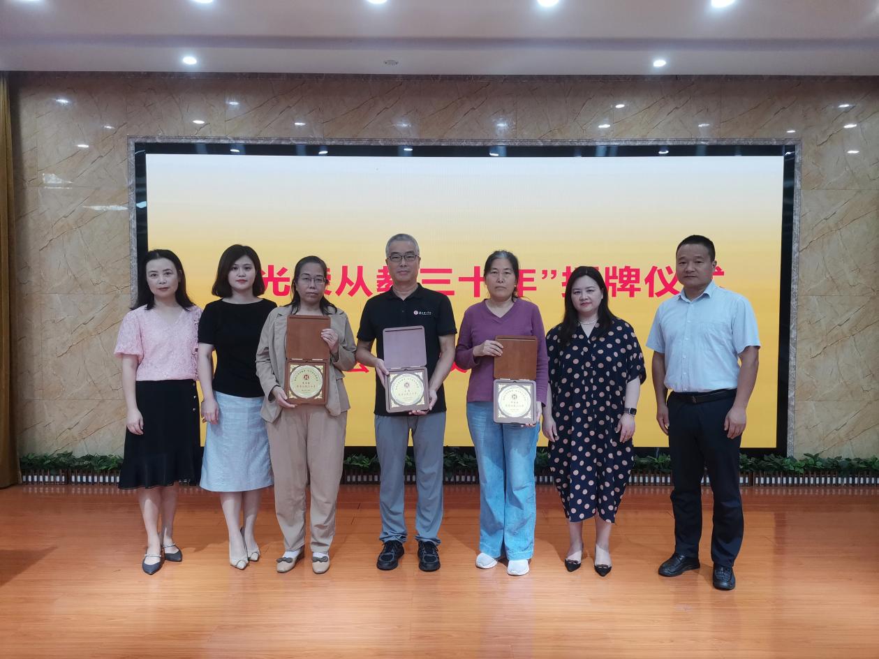 “光荣从教三十年”授牌仪式上,外国语学院班子成员为教龄达到三十年的教师们颁发纪念牌。
