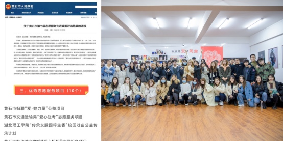 另外,黄石市文明委公布了黄石市第七届志愿服务先进评选的结果,“传承文脉国粹生香”校园戏曲公益传承计划项目获优秀志愿服务项目奖,黄石高校仅此项目获奖。