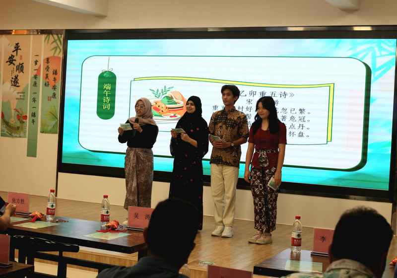 在文化展示环节,来自印度、印度尼西亚的留学生POOJARI SUJANA和ERRANDO TAMPATI向大家讲述端午节由来、习俗与屈原故事,印度尼西亚留学生NACKITA VHIONICA、WULAN OKA WIJAYA分享了汉语桥故事会节目,来自巴基斯坦、印度尼西亚留学生DILAN TONGLO TIKUPADANG、SIDDIQUE MISBAH等还朗诵了端午诗词,尽显对中华文化的热爱。