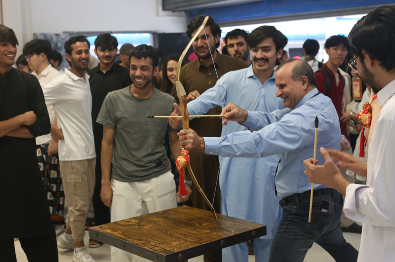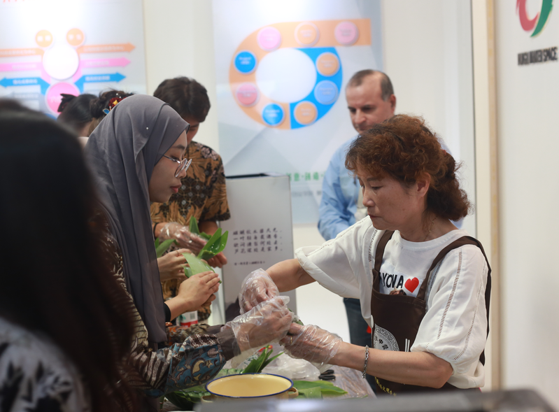 在文化体验区,民俗老师们化身“文化引路人”,用通俗易懂的语言,让中外师生了解端午节的历史渊源和民俗内涵,外籍师生积极参与“射五毒”“好运投壶”、包粽子、品端午特色食物等沉浸式体验活动。
